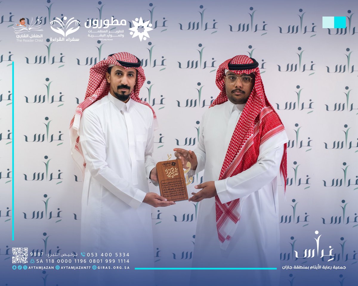 تشرفت جمعية غراس لرعاية الأيتام بمنطقة جازان بالتكريم من جمعية مطورون، تقديرًا لمشاركتها في إنجاح برنامج «سفراء القراءة»، بمشاركة نخبة متميزة من فتيات الجمعية، والذي يهدف إلى صناعة جيل قارئ واعٍ ومؤثر.