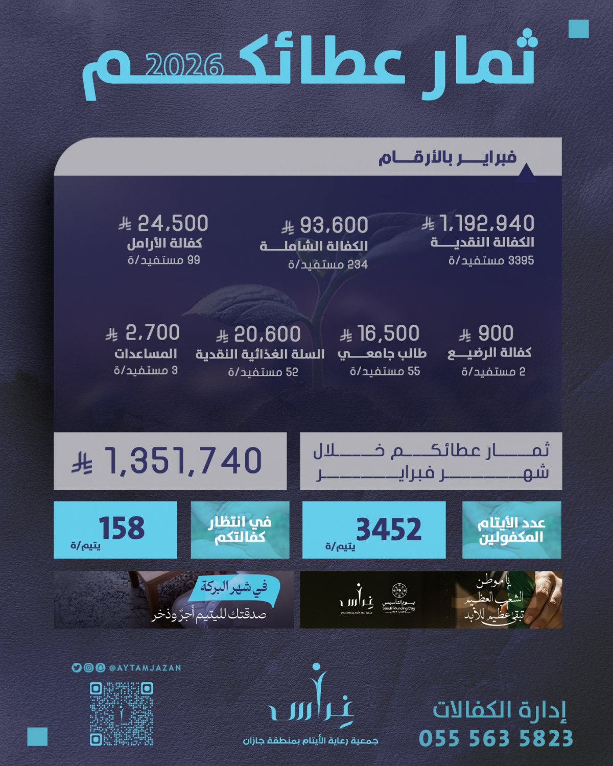 وشملت التبرعات الكفالة النقدية، والكفالة الشاملة، وكفالة الأيتام والأرامل، إضافة إلى دعم الطلاب الجامعيين، وكفالة الرضيع، والمساعدات الغذائية، بما أسهم في خدمة 3,452 يتيمًا ويتيمة، وتحقيق الاستقرار المعيشي والتعليمي للمستفيدين.