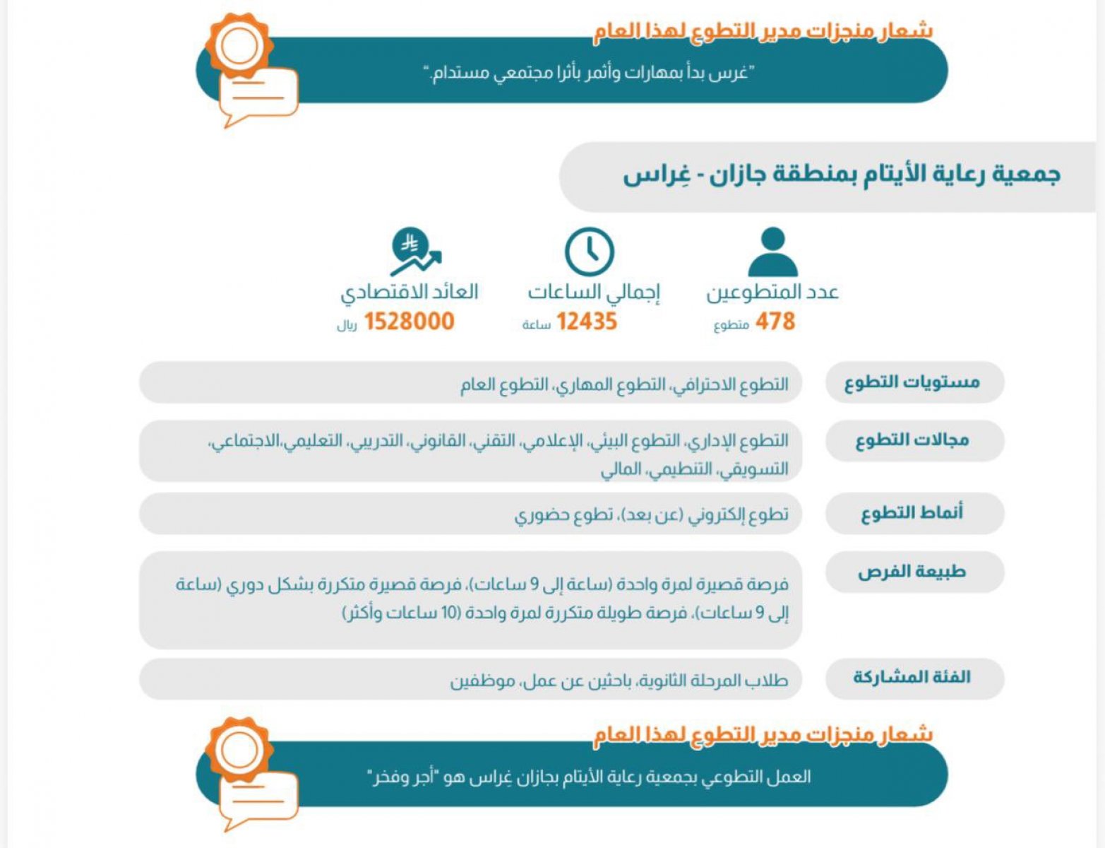 حظيت جمعية غراس لرعاية الأيتام بمنطقة جازان بصفحة استعرضت من خلالها أثرها التطوعي، حيث ترصد أثر 478 متطوعًا و12,435 ساعة تطوعية بعائد يتجاوز 1.5 مليون ريال.